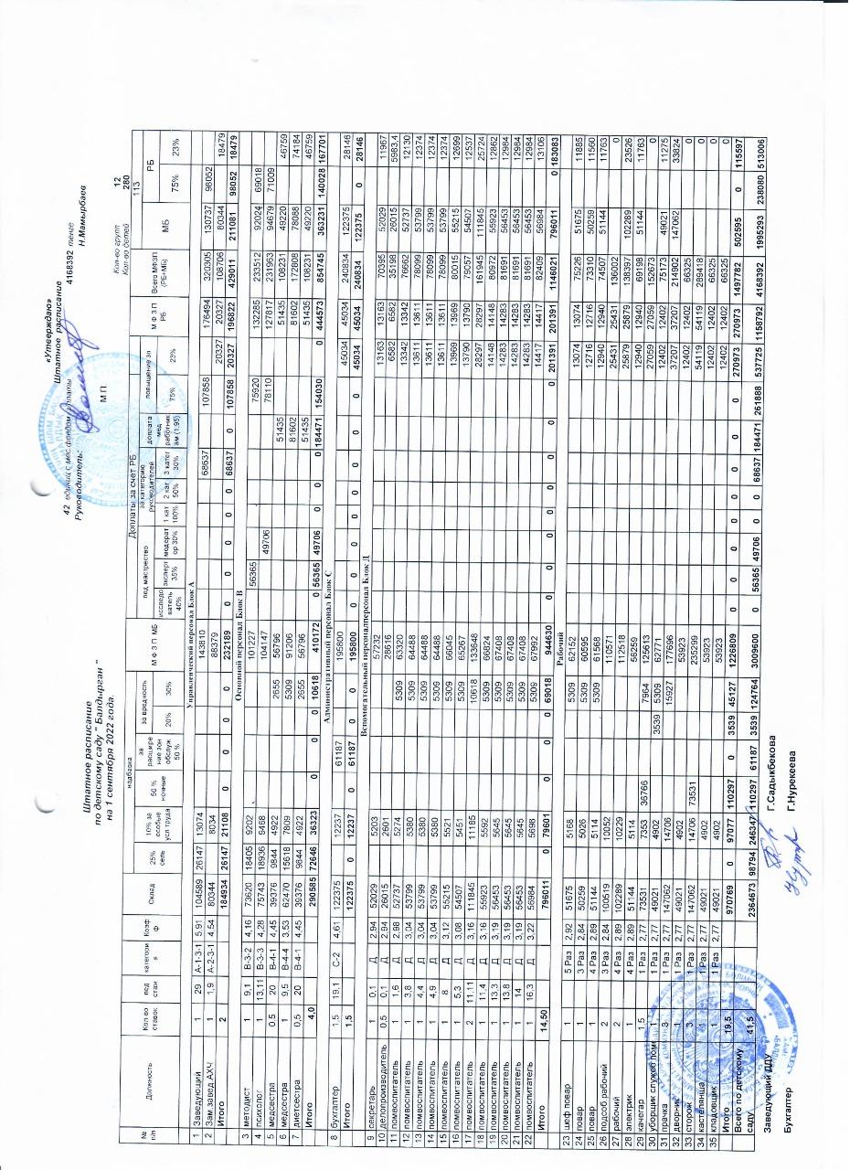Штатное расписание по детскому саду "Балдырган" на 1.09.2022 года