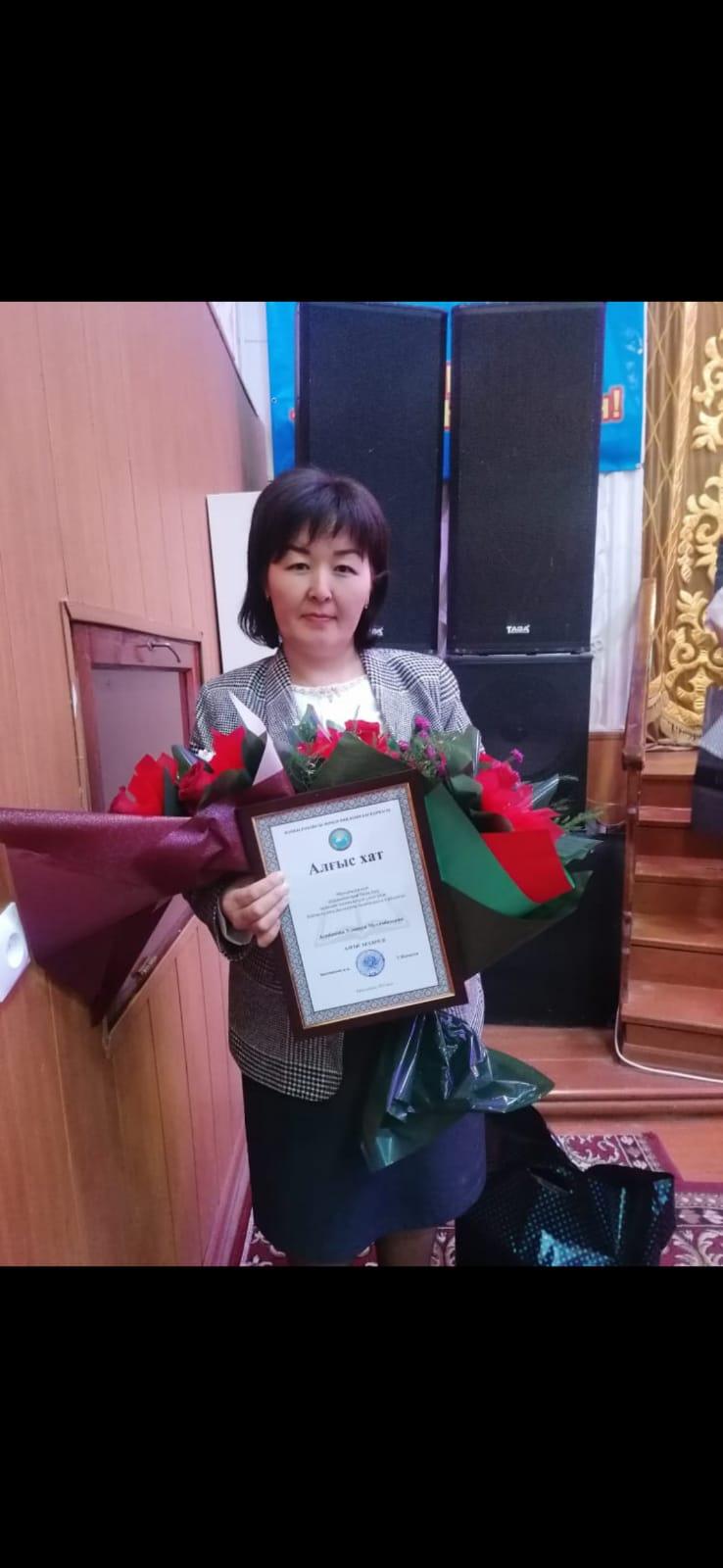 Тәрбиеші Алибекова Ұлмекен мұғалімдер күніне орай білім беру саласына қосқан үлесі үшін Жамбыл облысы әкімдігінің білім басқармасының "Алғыс хатымен" марапатталды.