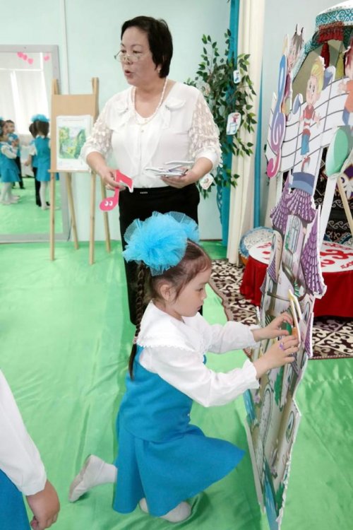 "Жұлдыздар" мектепалды тобының тәрбиеленушілерімен музыка жетекшісі Байсариева Фарида "Көңілді ноталар" тақырыбында ойын түрінде ұйымдастырылған іс - әрекет өткізді. "Ноталар үйшігі", "Сиқырлы таяқшалар" атты мақсатты ойындар ұйымдастырды.